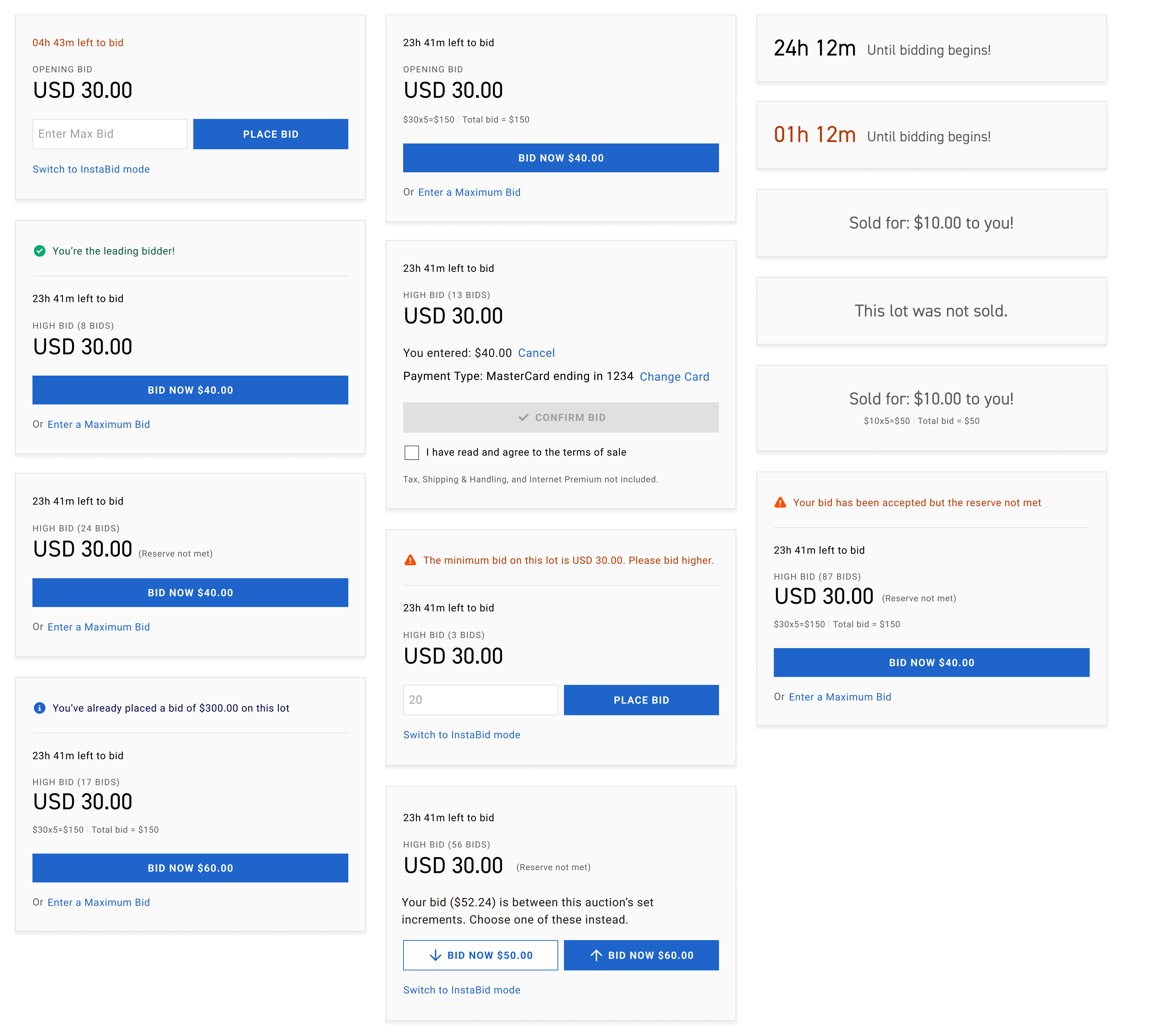 While auditing I decided to divide the bid widget into 3 main states: Pre-bidding, During Auction, and Post-bidding. I also learned about different types of lots, such as lots with piecemeal, lots with reserve price, etc.